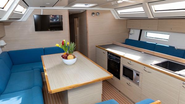 This custom-built yacht features a thoughtfully designed layout. The fully equipped galley, complete with an island bar, connects seamlessly to an indoor dining and lounging area. Outside, the bow and stern offer spacious seating for sunbathing or enjoying the sea breeze. Each cabin includes its own bathroom with en-suite or shared facilities, and an outdoor shower provides a refreshing spot to rinse off after swimming.